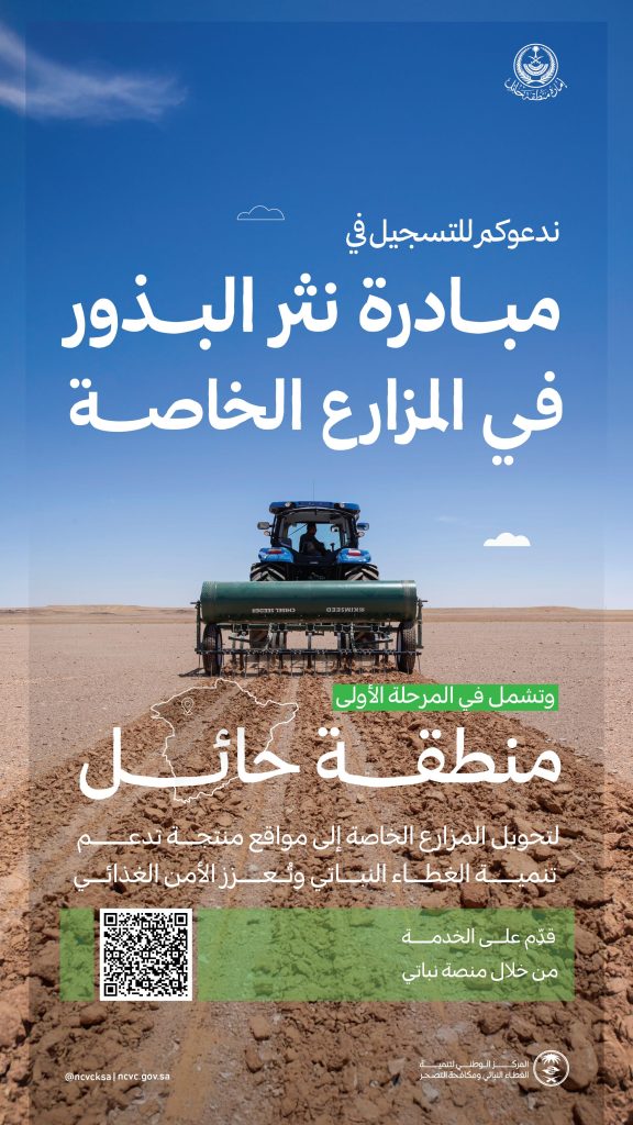 ودعا المركز أصحاب المزارع إلى الاستفادة من المبادرة عبر التقديم على الخدمة من خلال منصة “نباتي”، موضحًا أن نثر البذور في المزارع الخاصة يمثل فرصة استراتيجية لإنتاج نباتات رعوية محلية تتناسب مع طبيعة المواقع، بما يسهم في تحويلها إلى نظم إيكولوجية منتجة وقادرة على دعم التنمية البيئية والاقتصادية.