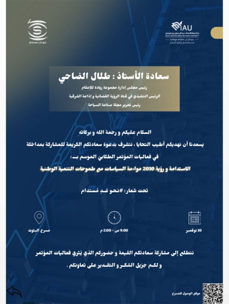 وجهت جامعة الإمام عبدالرحمن بن فيصل، ممثلة بكلية الآداب – قسم الاتصال وتقنية الإعلام، دعوة رسمية لسعادة الأستاذ طلال الضاحي، رئيس مجلس إدارة مجموعة ريادة للإعلام والرئيس التنفيذي لقناة الرؤية الاقتصادية وإذاعة الشرقية، للمشاركة بمداخلة نوعية ضمن فعاليات المؤتمر الطلابي الموسوم بـ “الاستدامة ورؤية 2030: مواءمة السياسات مع طموحات التنمية الوطنية”، والذي يُقام تحت شعار: #نحو_غد_مستدام.